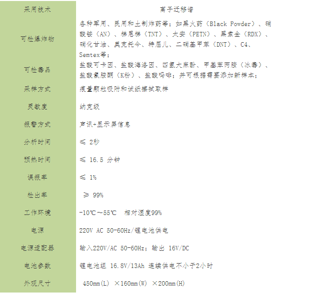 1) 不含放射性源,使用安全、方便,能準確分析出爆炸物和毒品成分;