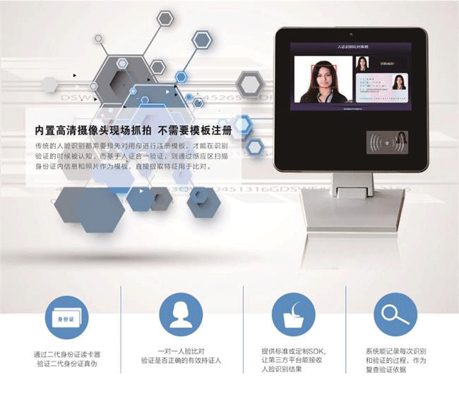 人證識別系統,以身份證和人像的比對為核心,系統通過提取身份證內的信息與現場拍照進行比對,可以快速辨別出證件與持證人是否一致,識別率高達98%以上,內置高清攝像頭現場抓拍,不需要模板注冊,傳統的人臉識別都需要預先對用戶進行注冊模板,才能在識別驗證的時候被認知。而基于人證合一驗證,則通過感應區掃描身份證內信息和照片作為模板,直接提取特征用于比對。